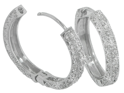 1.25 Ct. TW Round Diamond Hoop Earrings: Adding timeless design with a modern favorite is what we achieved in our latest creation, combining the old with the new. This pair of hoops has a total weight of 1.25 carat in round brilliant cut diamonds all with shining white F color and amazing eye clean VS-2 clarity. These glittering gems are set in intricately designed 14 karat white gold hoops with the alluring miligrain detail and exquisite hand carved antique etching. They hold to the ears with safe and comfortable locking posts making for a joy to wear all day without any fear of falling out. They’re also available in yellow gold, please specify how you would like us to make them for you.