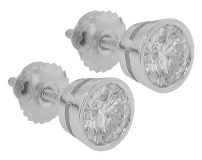 0.66 Ct. TW Round Diamond Stud Earrings in Bezel Screw Back Mounts: A stunning pair of exceptional diamonds can be proudly displayed on your loved ones ears, the absolute perfect gift for the holidays. These diamonds are round brilliant cut stones with exceptionally white F color and top notch VS-2 clarity giving off superior fire and scintillation and with a total weight of 0.66 carat they're sure to be an eye catcher on the ears. These spectacular stones are bezel set in 14 karat white gold mountings featuring the safe and secure screw back earring posts that only come off when you want them to. A marvelous gift for the holidays or a special "I love you" gift for any other occasion call us right now and get these gorgeous earring on her ears today.