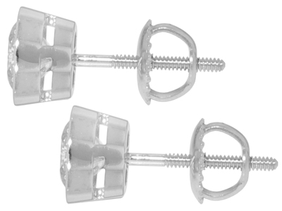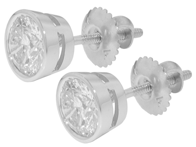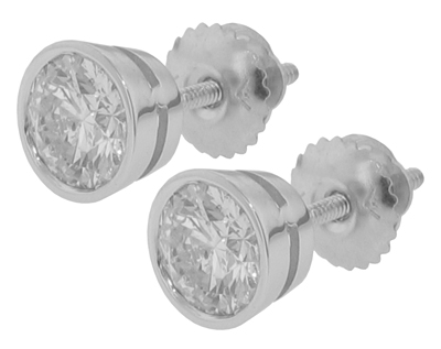 0.84 Ct. TW Round Diamond Stud Earrings in Bezel Screw Back Mounts: A stunning pair of exceptional diamonds can be proudly displayed on your loved ones ears, the absolute perfect gift for the holidays. These diamonds are round brilliant cut stones with exceptionally white F color and top notch VS-2 clarity giving off superior fire and scintillation and with a total weight of 0.84 carat they're sure to be an eye catcher on the ears. These spectacular stones are bezel set in 14 karat white gold mountings featuring the safe and secure screw back earring posts that only come off when you want them to. A marvelous gift for the holidays or a special "I love you" gift for any other occasion call us right now and get these gorgeous earring on her ears today. |