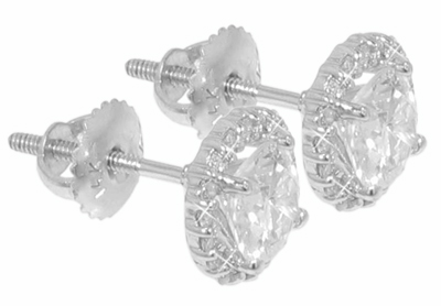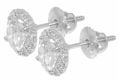 2.18 Ct. TW Round Diamond Stud Earrings in Halo Screw Back Mounts: Offering you an exquisite style at an exceptional price M. A. Jewelry Designs brings you these stunning stud earrings with in accented halo mountings. This pair of round brilliant cut diamonds have a total weight of 1.68 carat with carefully matched white F color and sparkling clean to the eye VS-2 enhanced clarity. They’re marvelously highlighted with another 0.50 carat of round diamonds that form gorgeous halos around each diamond as they sparkle on her ears. They attach safely and securely with 14 karat white gold screw back posts so there is never any need to worry about them falling out on their own. Give her a gift she’s certain never to forget or take off with our amazing stud earrings. Call us now with any questions or feel free to make us an offer.