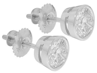 2.24 Ct. TW Round Diamond Stud Earrings in Bezel Screw Back Mounts: A stunning pair of exceptional diamonds can be proudly displayed on your loved ones ears, the absolute perfect gift for the holidays. These diamonds are round brilliant cut stones with exceptionally white F color and top notch VS-2 enhanced clarity giving off superior fire and scintillation and with a total weight of 2.24 carat they’re sure to be an eye catcher on the ears. These spectacular stones are bezel set in 14 karat white gold mountings featuring the safe and secure screw back earring posts that only come off when you want them to. A marvelous gift for the holidays or a special “I love you” gift for any other occasion call us right now and get these gorgeous earring on her ears today.
