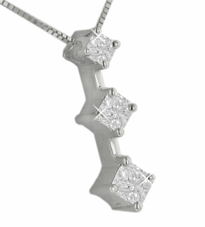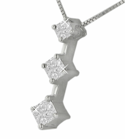 0.50 Ct. TW Princess Diamond Drop Pendant in 14 kt. With 16: Truly a wondrous sight our princess diamond drop pendant will make a stunning gift under the tree this holiday. Three beautifully matched F white color and VS-2 clarity princess diamonds hang from the neck on this 14 karat white gold bar prong setting displaying all the beauty these 0.50 carat of stones have to offer. Included in the package is an 16 inch cable link chain so this gift is ready to wear right when she opens the package. Call us today about this stunning gift for your special lady.