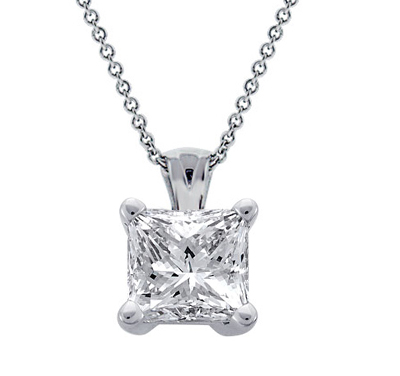 0.33 Ct. Tw Princess Cut Diamond Solitaire Pendant in 14 Kt. With 18: The princess cut diamond has a unique sparkle that has been an eye catcher for many years and now you can put one of these magnificent gems around your special lady's neck. This stone is an princess cut with fantastically white F color and exquisitely eye clean VS-2 clarity and a total weight of 0.33 carat. It is expertly set in this 14 karat white gold prong basket setting and hangs from her neck on an 18 inch box chain we include with your purchase. She will be certain to love this one of a kind princess cut diamond pendant, a piece of jewelry she will treasure for life
